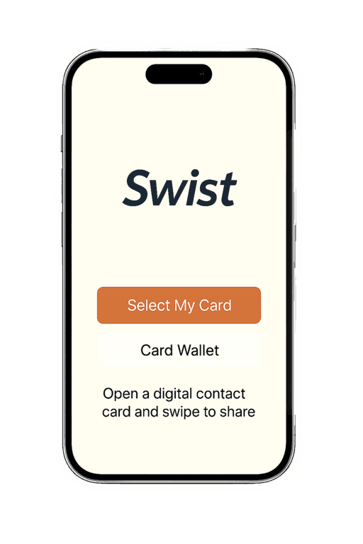 Swist is a mobile app that enables entrepreneurs, executives, officials, consultants, businesspeople - and everyday individuals - to instantly share their contact information with just one swipe. No scanning, no setup - just open, select, and swipe.